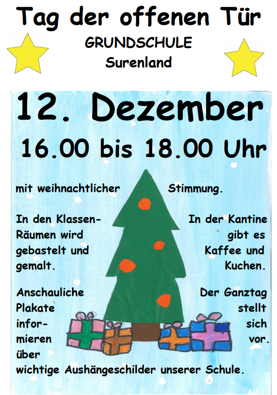 Wir laden euch und eure Familien herzlich ein zum Tag der offenen Tür an der Schule Surenland! Am 12.12.2025 von 16.00-18.00 Uhr könnt ihr unsere Schule entdecken, in die Klassen schauen, mitmachen und viel Spaß haben.