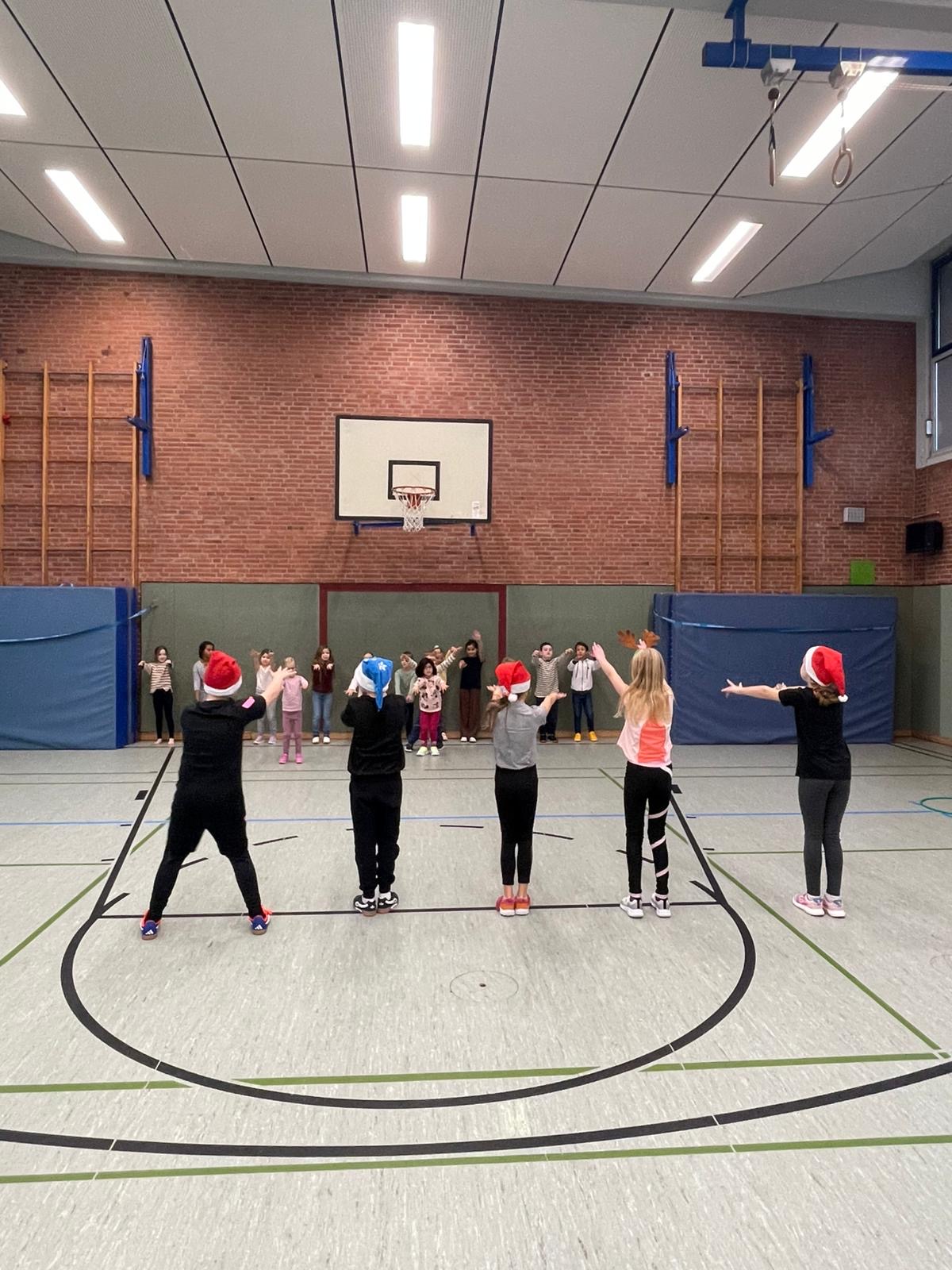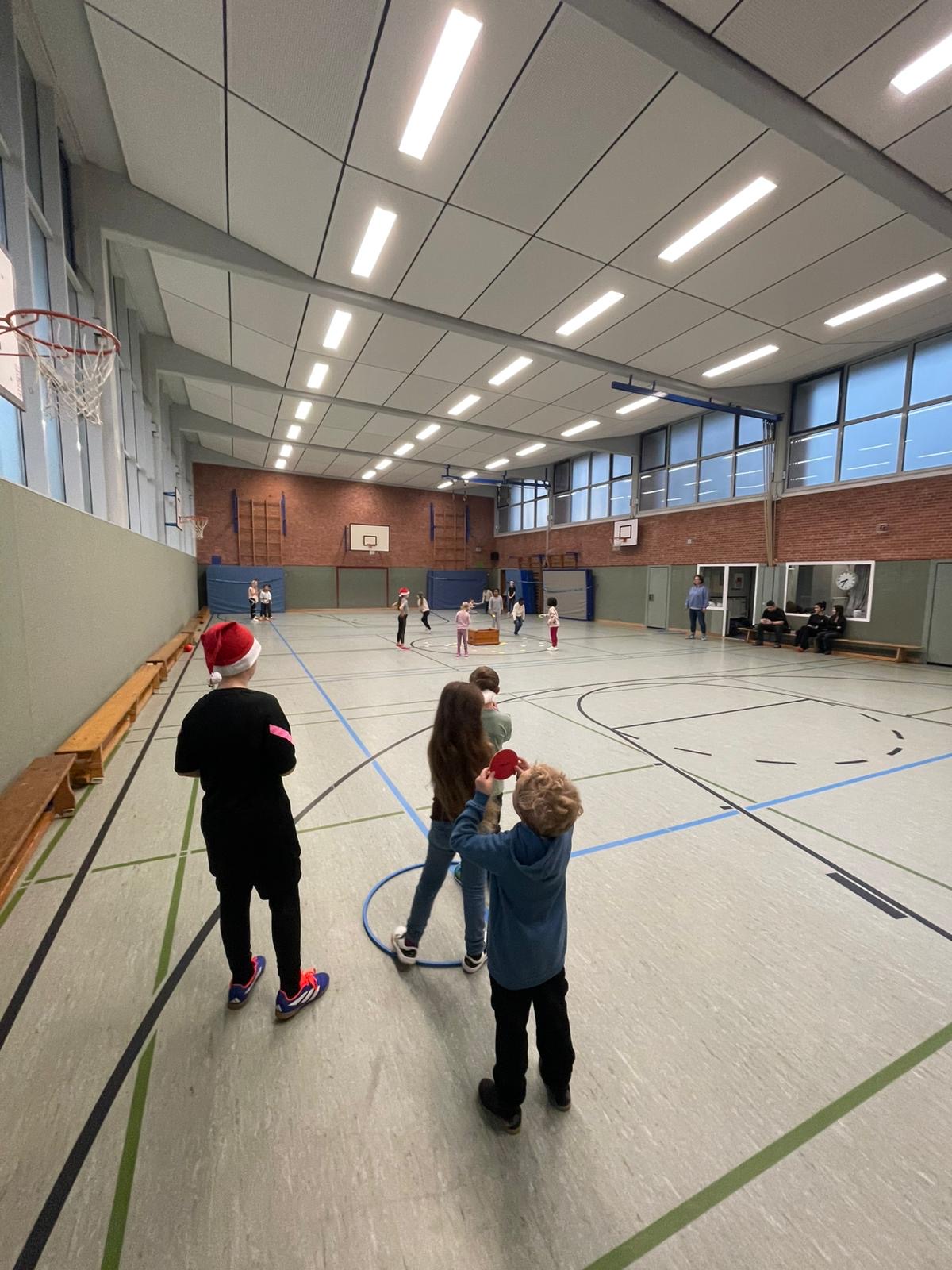 In weihnachtlicher Stimmung fand der Staffeltag des Jahrgangs 1 an der Schule Surenland statt. Für unsere neuen Kinder war es das erste Sportevent an der Schule – und ein voller Erfolg! Mit viel Begeisterung und Teamgeist meisterten die Klassen verschiedene Teamspiele. Dabei standen Spaß, Bewegung und das gemeinsame Erleben im Vordergrund.