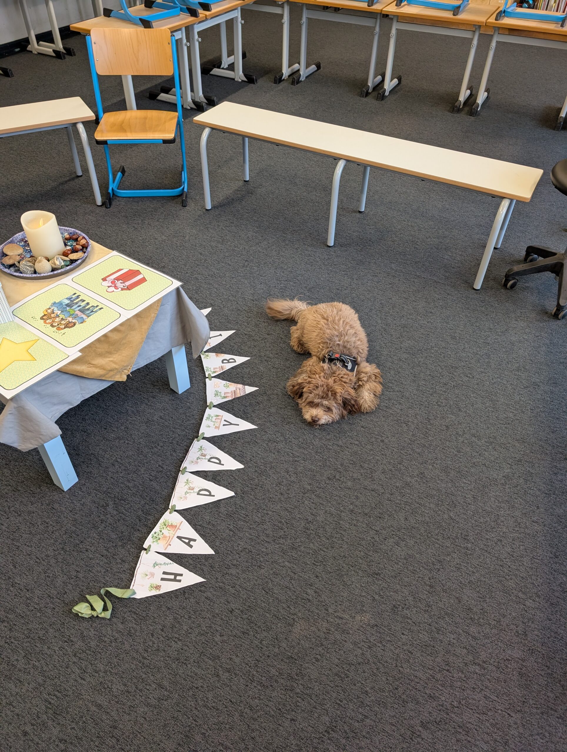 Frida ist im Schulalltag der Kinder stets ein Blickfang. Bei ihren regelmäßigen Besuchen in den Klassen lernen die Kinder den Umgang mit Hunden und etwas über die Nahrung, den Körperbau und die Haltung der Tiere.